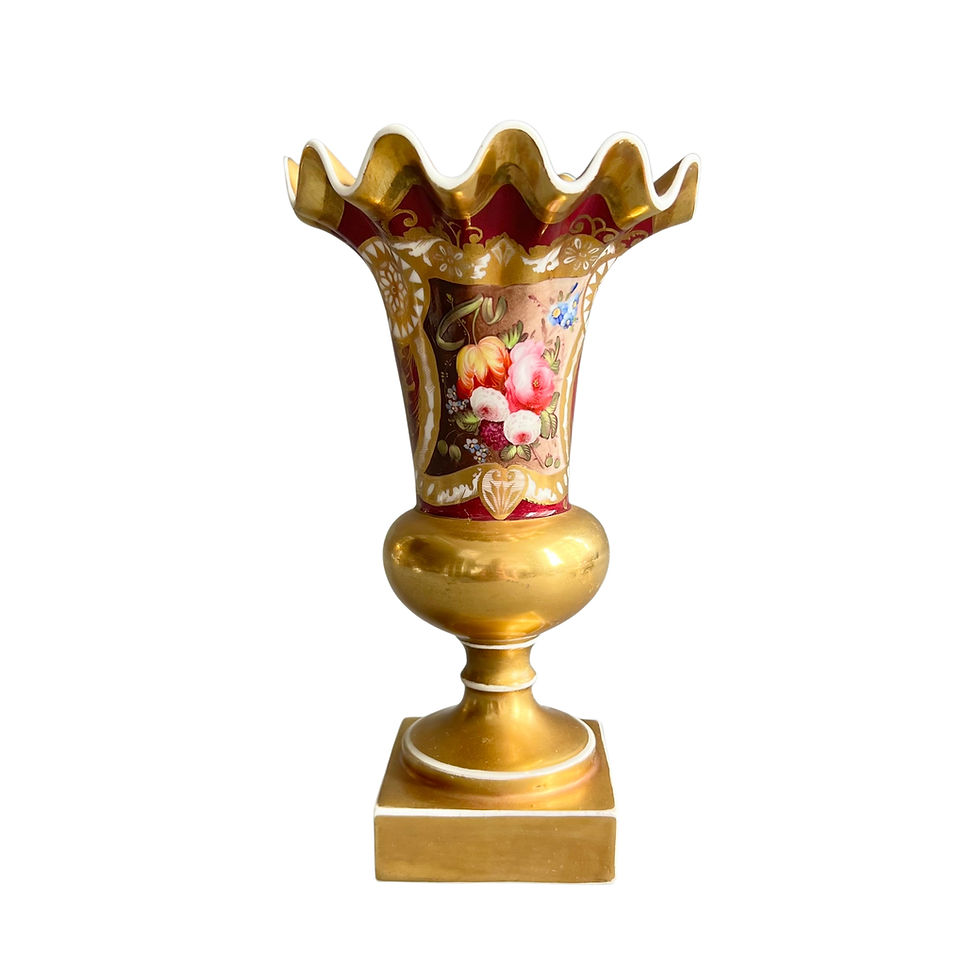 Samuel Alcock vase, wave-edge, maroon, rich gilt, flower reserve, ca 1825