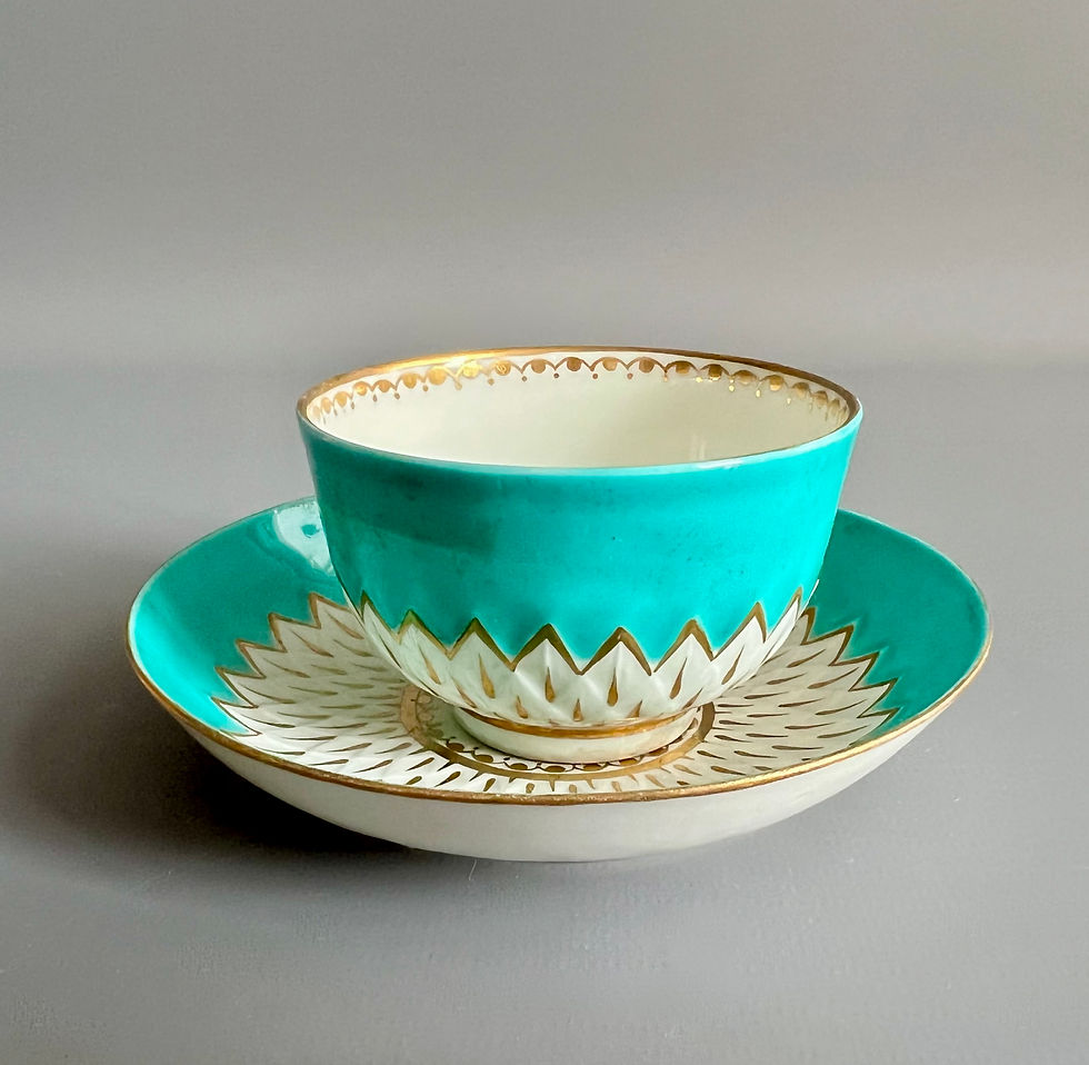 This is a beautiful teacup and saucer in the Grass design. Both items carry the 1st Black Mark, which was used between 1863 and 1891. This teacup has a very narrow shape, as was fashionable in the late Victorian time, and would be perfect for coffee as well.