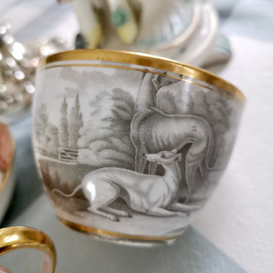 It's a dark rainy spring morning here, and when picking a little cup for my morning coffee I was enamoured by the variously printed Spode cups from the first two decades of the 19th Century. Here, you see my favourite little coffee can with whippets ready to start the day, surrounded by two other sets. They are incredibly finely printed and today I will explain a bit about how these treasures were made.