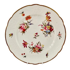 There was a third method of printing: pluck and dust. This technique was used in about the same time period and it was in fact a hybrid between transfer printing and bat printing. First, the copper plate used for printing was heated and covered in oil. The gelatine bat was pressed onto the plate, but then, rather than being pressed onto the piece of porcelain directly, it was pressed onto a piece of paper. This piece of paper was then used to transfer the image onto the porcelain. Using paper made it possible to cover much larger areas and you can see how the beautiful red rose border would have been transferred by a long piece of paper that could be used in stages to cover as long a rim as you wanted.
