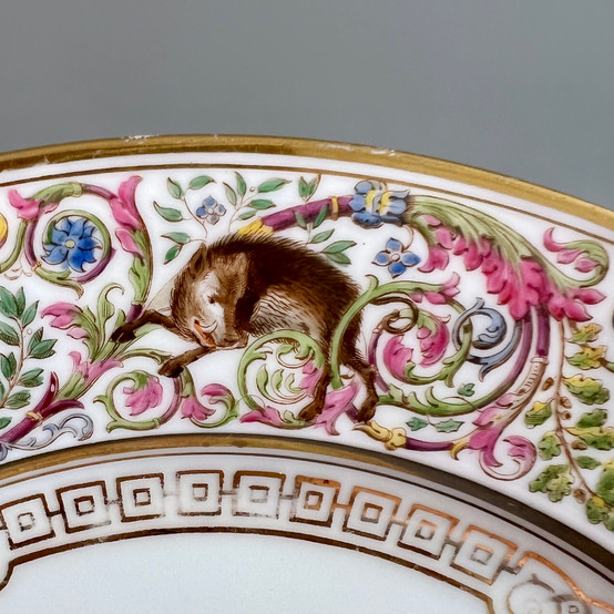 Today I have a wonderful set serving 12 on offer, with three spectacular comports set in richly decorated ormulu stands. And the plates themselves are wonderful; the detail never ends. Hounds, boar, deer, birds of prey, pheasants, snakes... all set in meandering foliage and scrolls with beautiful autumnal colours. The whole set is also beautifully gilded. The ormulu comport stands are stunning too, with scrolled feet and festoons of succulent vines.