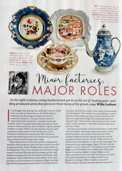 Today I am catching up, after a few days complete rest, on my latest article in Homes & Antiques. This time it's about the "minor" factories of the early 19th Century, which actually played quite a major role in British porcelain.
