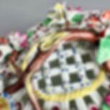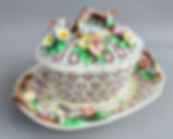 As is usual for the Worcester chestnut baskets, this one has beautiful appliqué flowers, and very charming branches for handles. The body of the basket is also covered with little puce and yellow flowers all over. Sometimes these baskets come in simple blue and white, and sometimes they have only a limited number of colours or flowers; this set, however, is exceptionally colourful.