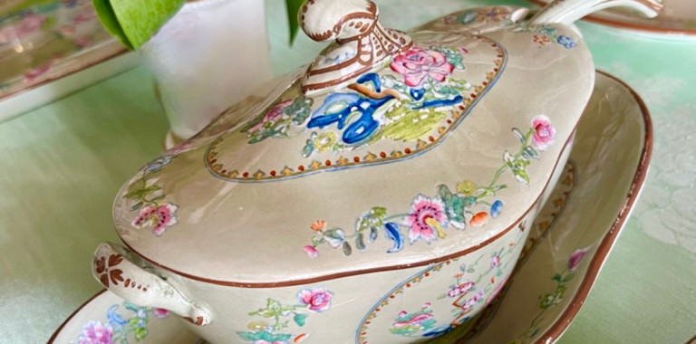 Another high-footed one is the stylish maroon sauce tureen from about 1842, again with beautiful flower posies, a similar shape to the first one mentioned above.