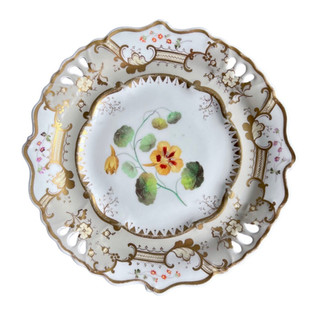 Of course, I found several in Murray Pollinger's collection of Samuel Alcock porcelain, which are now up in the shop. There is a very stylish grey, pale yellow and gilt one from about 1843 with rich acanthus motifs and beautiful flower posies. It is a gorgeous colour combo, in my view, and I have also several plates in that colour scheme, see at the bottom of the page.