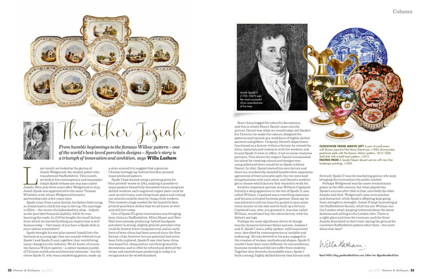 Last month, in my column in Homes & Antiques, we looked at the genius of Josiah Wedgwood, the modest potter who transformed Staffordshire. This month we look at his contemporary and namesake: Josiah Spode, whose son was also called Josiah.