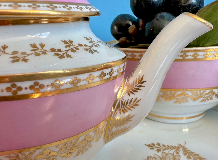 But this little set is still restrained, yet very refined. The pale pink colour is beautiful, and you can see in the way it has aged that it was a challenge to produce it - but it's still there, and still beautiful. The gilding is not opulent, but very gracious with its Neoclassical sprigs.