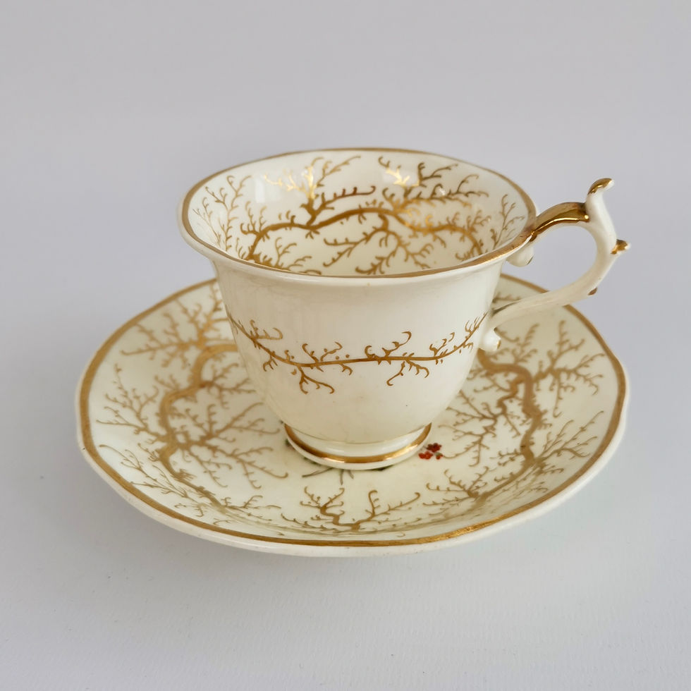 Rockingham coffee cup and saucer, gilt seaweed, flowers, Rococo Revival, 1832